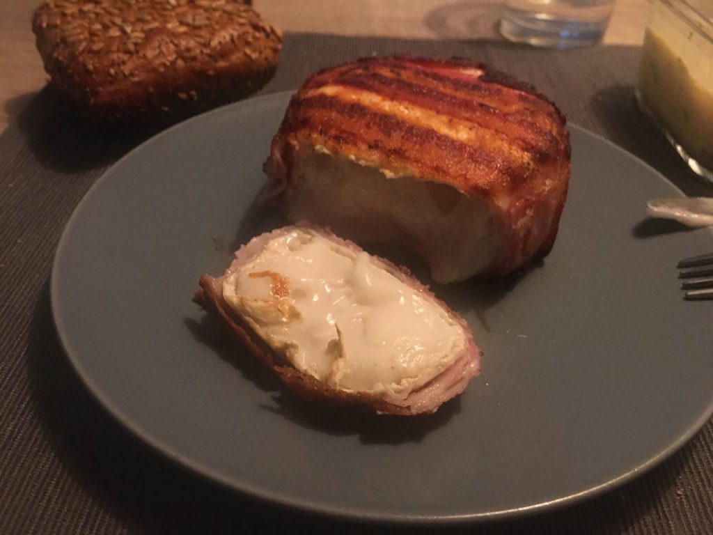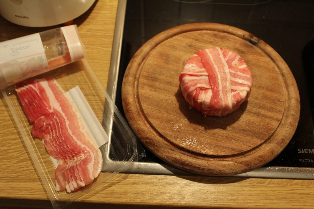 Käse im Speckmantel speckmarschall empfiehlt: 150 g Ziegen-Camembert 100 Speck 2*10-6 m³ Pflanzenöl Salat nach Wahl Baguette nach Wahl oder auch: