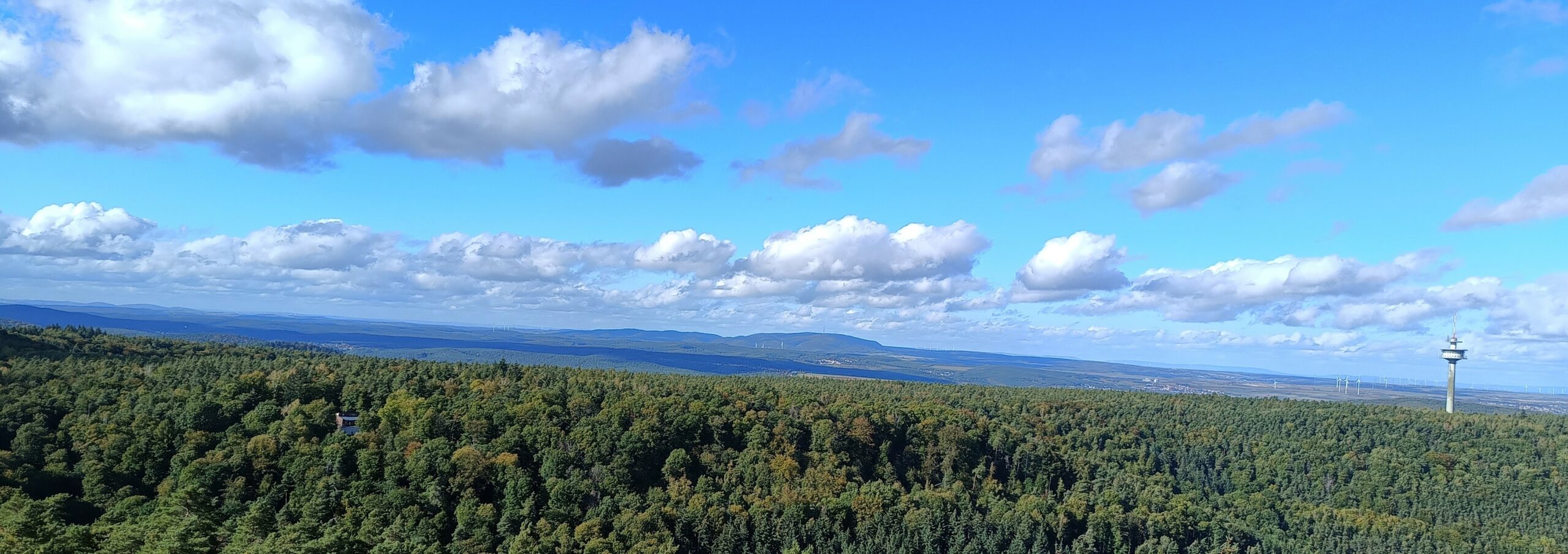 Blick auf den Donnersberg vom Peterskopf (493,5 m ü. NHN) am Ostrand des Pfälzer Waldes.